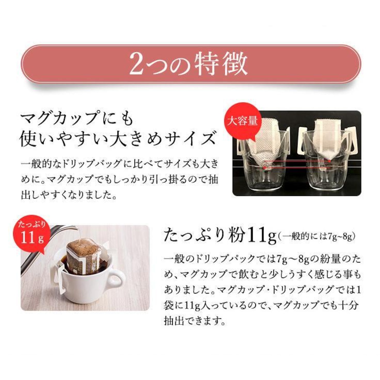 一包あたり11gと大容量でコーヒーカップ2杯分淹れることが
